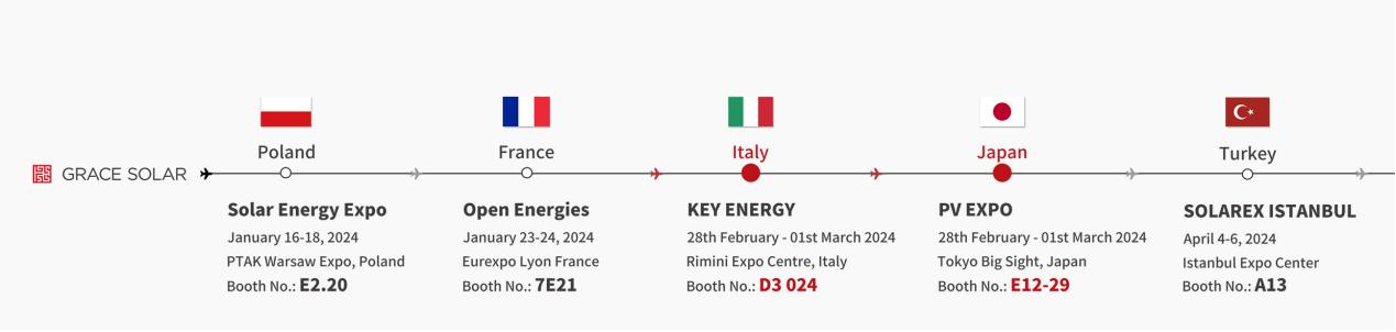 From February 28th to March 1st, two international exhibitions - the Italy&Japan PV Exhibition will be held on the same day. Grace Solar will present a fully upgraded lineup of super star products and innovative technology, looking forward to attending the Zero-Carbon Event with global photovoltaic partners.