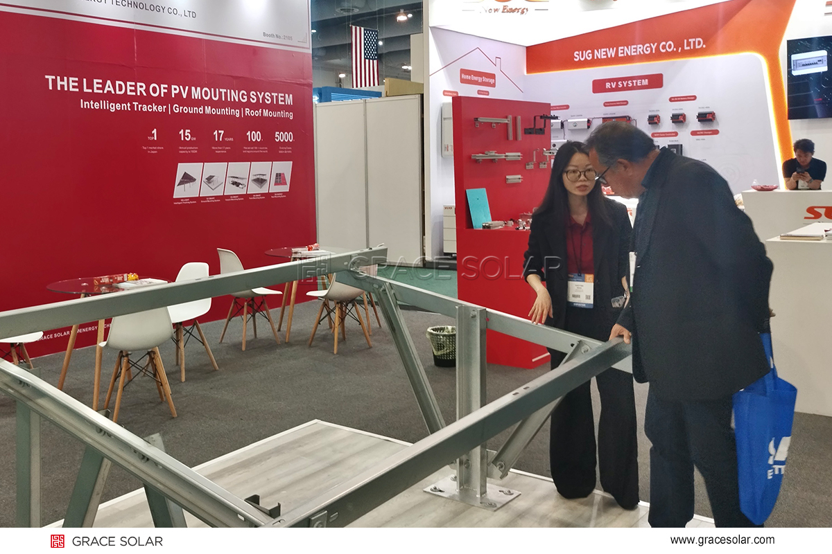 Designed for Mexico’s windy, sandy, and high-salinity environments, Grace Solar’s ground-mounted system made of AlMgZn-coated carbon steel became an instant highlight. Featuring multi-layer anti-corrosion technology and a reinforced structure, the product effectively withstands abrasive sand and corrosive conditions—making it ideal for desert power plants and coastal projects. Its exceptional durability attracted significant attention from investors and EPC teams, leading to in-depth discussions.