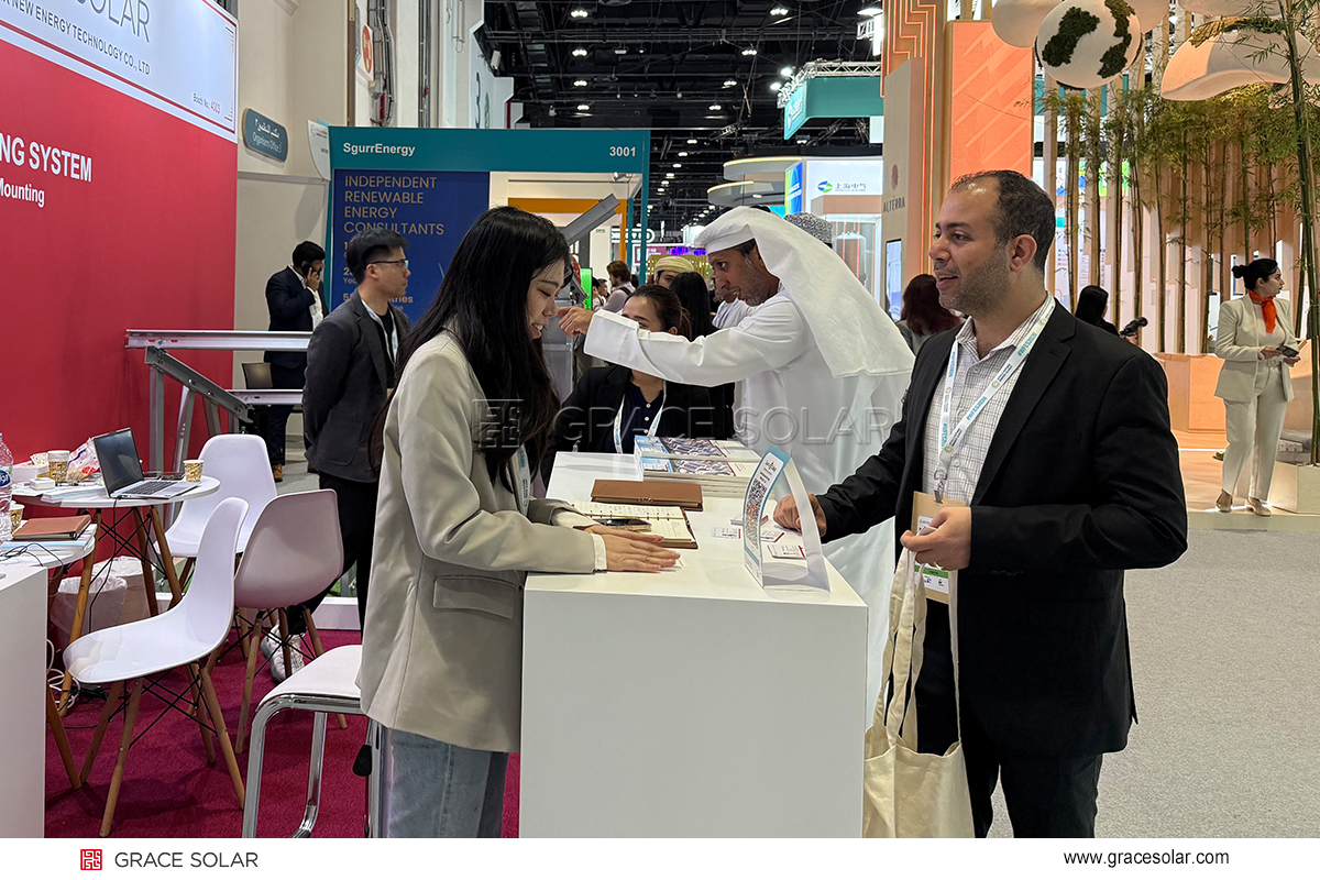 From January 13th to 15th, 2026, Grace Solar made a grand appearance in Abu Dhabi! As the most influential energy event in the Middle East, the World Future Energy Summit (WFES) has been held for over a decade, gathering cutting-edge forces from the global energy sector. During the exhibition, Grace Solar engaged in in-depth discussions with the organizer, Mardas, jointly exploring the development trends of the Middle East photovoltaic market and the direction of technological innovation, further strengthening the foundation for local industry collaboration.