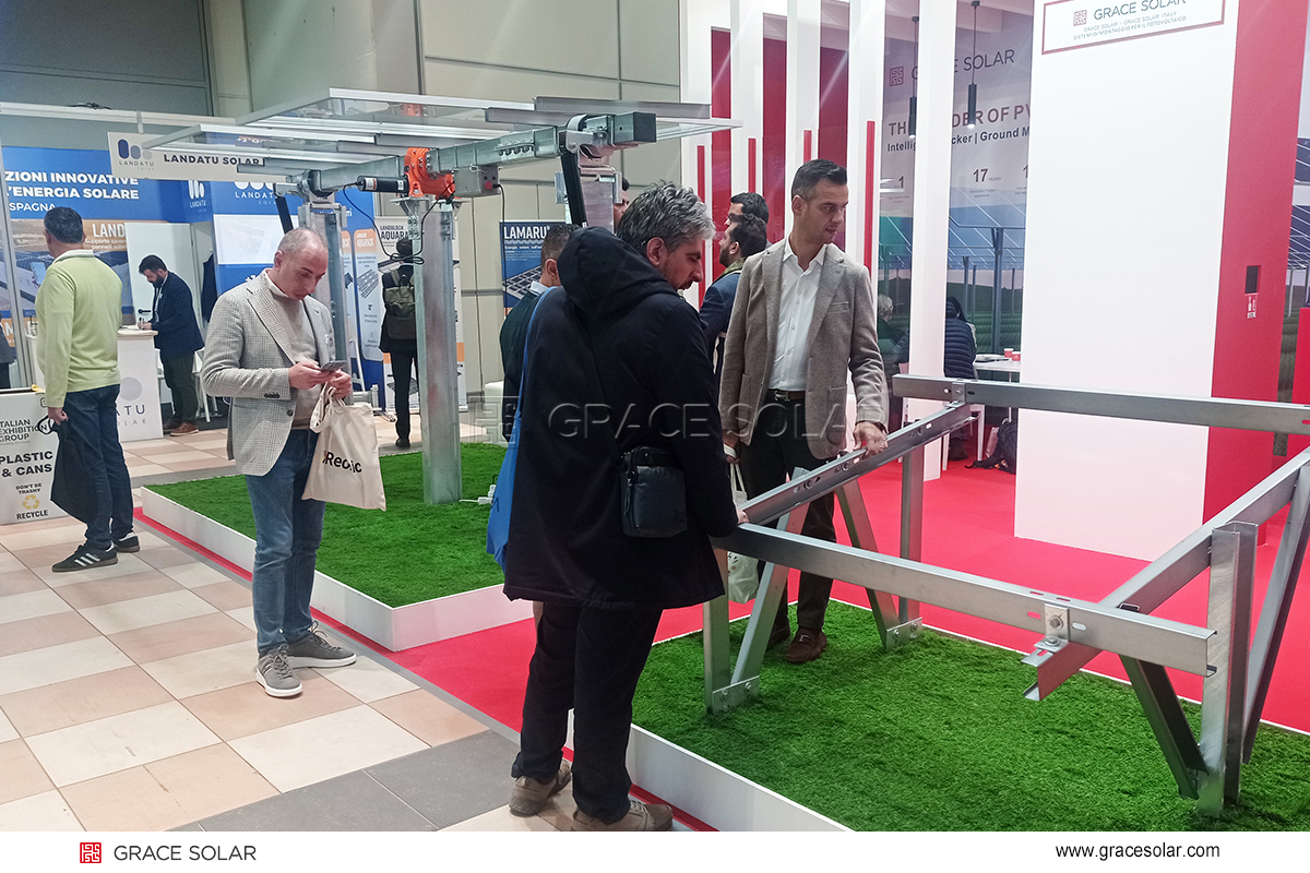 Designed for the typical Mediterranean climate characteristics of Italy and Southern Europe—intense summer sunlight, rainy winters, and frequent local strong winds—Grace Solar's new-generation smart tracking system became a technical highlight at the booth. The system enhances power generation efficiency while effectively responding to complex weather impacts, ensuring stable operation even under harsh conditions. Multiple power plant investors engaged in in-depth discussions with technical staff regarding its application in high-irradiation areas such as Southern Italy.